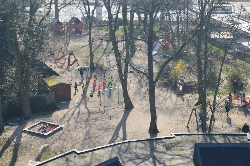 Das große parkähnliche Außengelände mit altem Baumbestand, Rasen und Spielfläche bietet vielfältige Möglichkeiten zum Bewegen, Toben und Spielen. Unser direkter Nachbar ist der Kindergarten der Lebenshilfe. Hier gibt es eine intensive Zusammenarbeit mit gemeinsamen Projekten und gegenseitigen Besuchen.