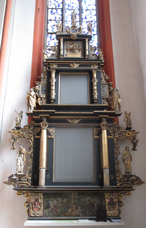 Der Hochaltar wurde im Chorraum vor der Apsis aufgestellt und blieb bis zu seiner Auslagerung während des 2. Weltkrieges in Benutzung. Seine Rückwand bildeten drei Gemälde mit den Themen Kreuzigung, Grablegung und Auferstehung. Geschnitzte Figuren der vier Evangelisten und der sieben Tugenden gehören ebenfalls zum Bildprogramm des Altars.